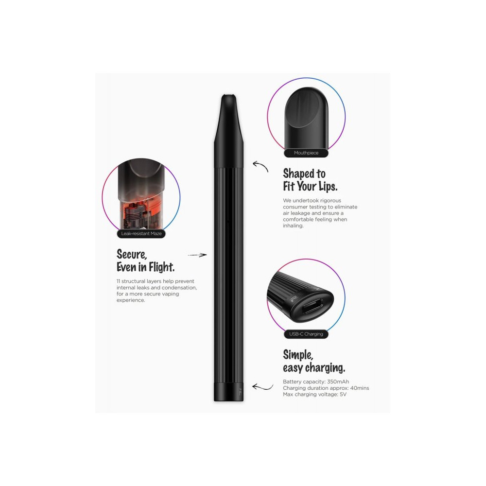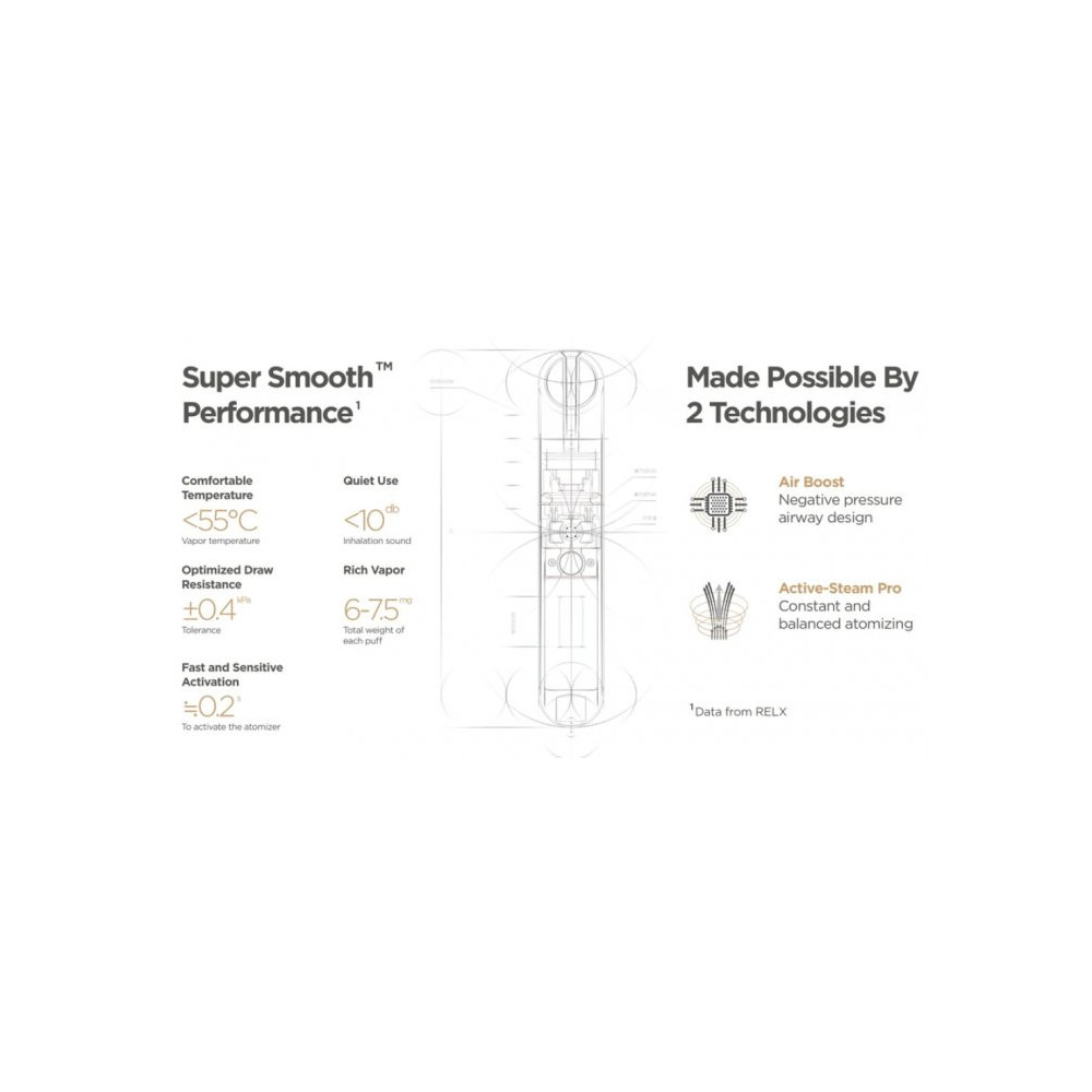 Elektronická cigareta nové generace, která je díky svým vlastnostem nejlepší alternativou ke klasickým cigaretám. Vestavěná baterie o kapacitě 350 mAh disponuje LED indikátorem stavu nabití, automatickým spínačem a USB-C portem pro rychlé nabíjení za pouhých 40 min. Předplněné cartridge obsahují 1,9 ml liquidu s nikotinovou solí o síle nikotinu 18 mg. Oproti obdobným zařízením se elektronická cigareta RELX Essential prezentuje kompaktní velikostí, skvělou kouřivostí a autentickou chutí liquidu. Liquidy SALT se od běžných liquidů odlišují tím, že mají nižší PH a obsahují stále více oblíbenou a žádanou nikotinovou sůl, díky které dochází k rychlejší a kvalitnější vstřebatelnosti = bez dráždivého pocitu v krku oproti klasickým liquidům. V přírodě se tato sůl volně vyskytuje v tabákových listech - díky tomu tyto liquidy obsahují přirozenou formu nikotinu, který je pro tělo lépe vstřebatelný a nezkresluje chuť liquidu. Velkou výhodou je rychlejší proces odpařování (nikotinová sůl se odpařuje při nižších teplotách) a daleko lepší vstřebatelnost, díky které je intenzita vapování nižší, takže spotřeba těchto liquidů s nikotinovou solí je nižší, než u klasických liquidů na stejném zařízení. Také se tím prodlužuje životnost žhavících hlav a snižuje spotřeba baterie. Tyto liquidy jsou velmi vhodné pro kuřáky, kteří přecházejí z klasických cigaret na elektronické, kdy je nutné, aby nový e-kuřák dostal do těla dostatečné množství nikotinu bez jakéhokoli dráždivého pocitu (škrábání, kašlání).