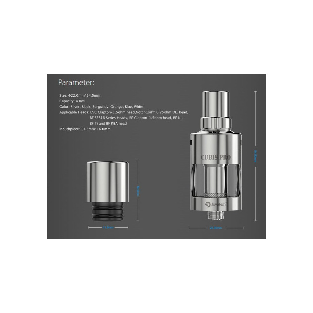 Má systém horního plnění, kde odšroubujete jen část pod náustkem a liquid plníte jedním ze dvou otvorů. Lze samozřejmě plnit i jako u předchozí verze, kde po odšroubování vrchní části, která obsahuje žhavící hlavu, plníte liquid do samotného těla clearomizeru, kde není již žádný kouřovod, takže v plnění nic nepřekáží a liquid můžete do clearomizeru doslova nalít a nemusíte se spoléhat na tenká kapátka nebo různé plnící lahvičky. Ve vrchní části se nachází i vylepšený přívod vzduchu pro optimální prožitek z vapingu. Celý clearomizer je plně rozebíratelný a vyrobený z nerez oceli a pyrexu. CUBIS Pro Vás překvapí novými atomizery LVC Clapton (úprava přívodu liquidu ke spirálce) a QCS (snadná výměna bavlny při zachování nerezové trubičky s vyfrézovanými otvory = Notchcoil). Můžeme ovšem používat samozřejmě i atomizery řady BF, BF Clapton = režim VW a BF SS316, které lze využit pro režim nastavování teploty. V balení je přibalen i další náustek, u kterého je vnitřní část spirálovitého tvaru, což je ochrana proti případnému prskání liquidu do úst.