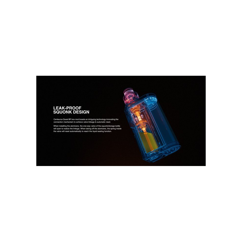 Centaurus Quest BF, jak je patrné již od prvního pohledu, přináší unikátní design, ultimátní pohodlnost a špičkovou kvalitu. Tento jedinečný bottom feeder posouvá Squonking na novou úroveň. Velmi chytře navržená Squonk lahvička pojme neuvěřitelných 9,5 ml e-liquidu a vy se tak nemusíte obávat, že vám náplň přes den dojde a můžete bezstarostně vapovat. Centaurus Quest BF přináší ohromující technologii zabraňující protékání, což může být u Squonk zařízení často problém. Při osazování atomizérem se spustí jednosměrná páčka, která zajistí plné těsnění a nulové protékání a při sundání ji automaticky resetuje drobná pružinka. Mod pracuje s jedním externím monočlánkem typu 21700 / 20700 / 18650 (s použitím přiloženého adaptéru), a kromě možnosti nabíjet baterii externě disponuje rychlým USB-C nabíjením. Je poháněn exkluzivním chipsetem Quest 2.0, který zaručuje plynulý chod, nabízí několik režimů vapingu a nechybí mu ani mnohé standardní bezpečnostní prvky. Centaurus Quest BF umožňuje nastavení výkonu až na 100 W a vybrat si můžete z Wattage módu s extra nastavením intenzity mezi soft, norm a hard, VPC, Bypass, Voltage i TC (SS904 / SS316 / Ti / Ni). Ovládání pomocí tří tlačítek a prostorný barevný TFT displej spolu s USB-C portem najdete na boční straně Modu.