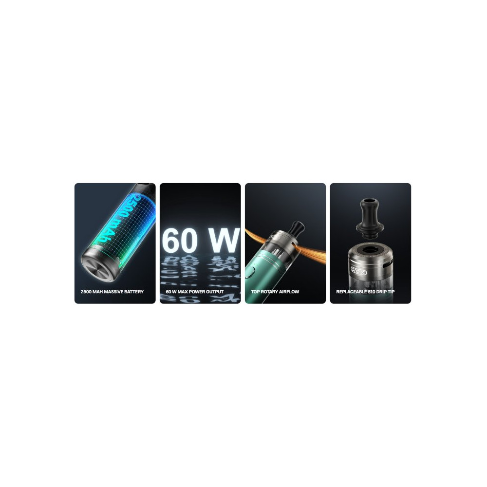 Doric 60 Pro Vás zaujme svým elegantním válcovým designem, který je vyroben z prémiového hliníku a poskytuje tak vynikající odolnost a lehkost. Zařízení je ideální jak pro úplné začátečníky, tak i pro zkušené vapery, kteří hledají řešení DTL & MTL vapingu. Tělo baterie disponuje monočlánkem o kapacitě 2500 mAh s USB-C portem. Čip GENE TT 2.0 dodává až 60 W výkonu ve třech stupních - MINIMUM / OPTIMAL / MAXIMUM s LED zobrazením. Spodní část baterie je opatřena důmyslným uzamčením proti nechtěnému sepnutí baterie nebo jako dětská pojistka. Tvorbu páry zajišťuje spínací tlačítko nebo systém automatického žhavení - stačí pouze potáhnout z náustku. Cartridge PnP X se stejnojmennou žhavicí hlavou pojme až 5 ml vašeho oblíbeného liquidu. V základním balení budete mít na výběr dvě žhavicí hlavy, a to PnP X o odporu 0,3 ohm a PnP X o odporu 0,6 ohm. Žhavicí hlavu je nezbytné pravidelně měnit pro zachování chuti a funkčnosti zařízení. Její výdrž je individuální.