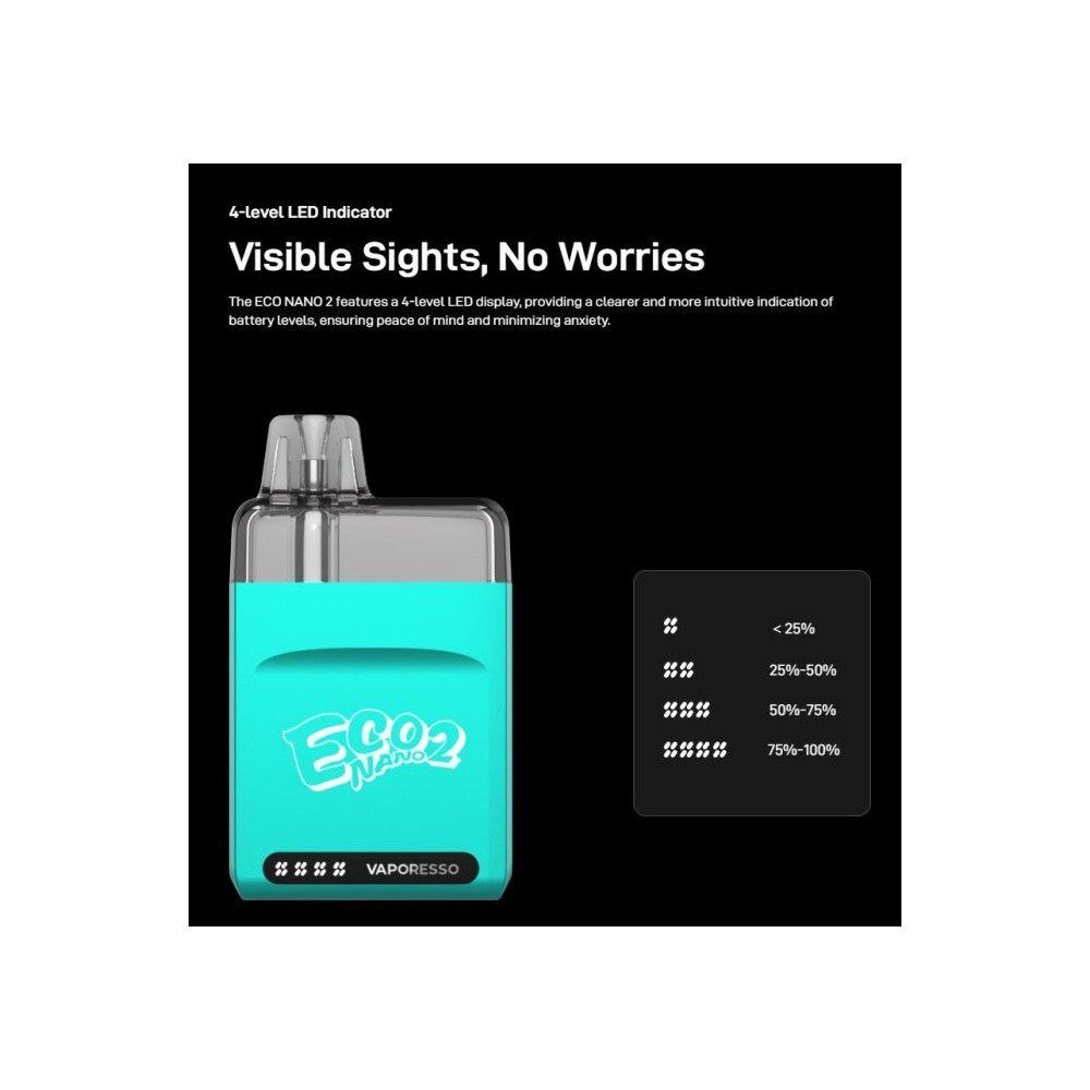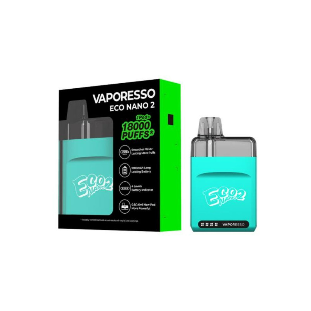 Vaporesso představuje druhé vydání kapesního Vape zařízení ECO Nano 2. Pod stylovým pláštěm baterie se nachází integrovaný monočlánek o kapacitě 1000 mAh s rychlým USB-C (1A) nabíjením, AXON čip pro intenzivní vapování a LED displej zobrazující stav nabití baterie. Tvorbu páry zajišťuje systém automatického žhavení - stačí pouze potáhnout z náustku. ECO Nano 2 je vybaveno cartridge o objemu 6 ml s vestavěnou žhavicí hlavou Mesh o odporu 0,6 ohm a technologií COREX = rychlejší a vyváženější odpařování liquidu. Žhavicí hlavu je nezbytné pravidelně měnit pro zachování chuti a funkčnosti zařízení. Její výdrž je individuální.