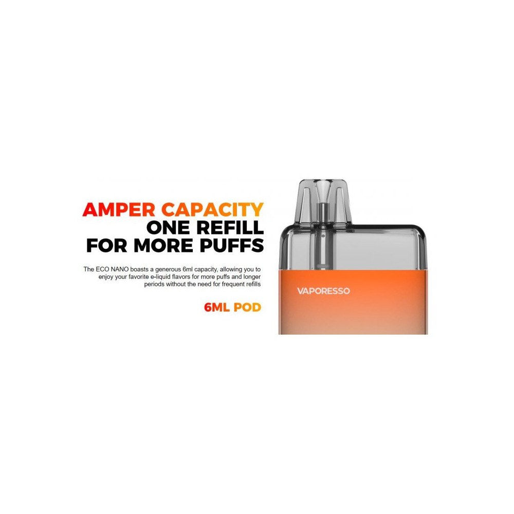 Ultimátní MTL zařízení pro vaping. Velikostí sice patří do skupiny menších POD systémů, avšak jeho nadstandardní parametry jsou bezkonkurenční. Tělo baterie disponuje vestavěným monočlánkem o kapacitě 1000 mAh s rychlým USB-C nabíjením a automatickým výkonem až 16 W. Tvorbu páry zajišťuje systém automatického žhavení - stačí pouze potáhnout z náustku. To, co dělá ECO Nano vyjímečným, je beze slova cartridge o objemu 6 ml s vestavěnou žhavicí hlavou Mesh o odporu 0,8 ohm a technologií COREX = rychlejší a vyváženější odpařování liquidu. Žhavicí hlavu je nezbytné pravidelně měnit pro zachování chuti a funkčnosti zařízení. Její výdrž je individuální.