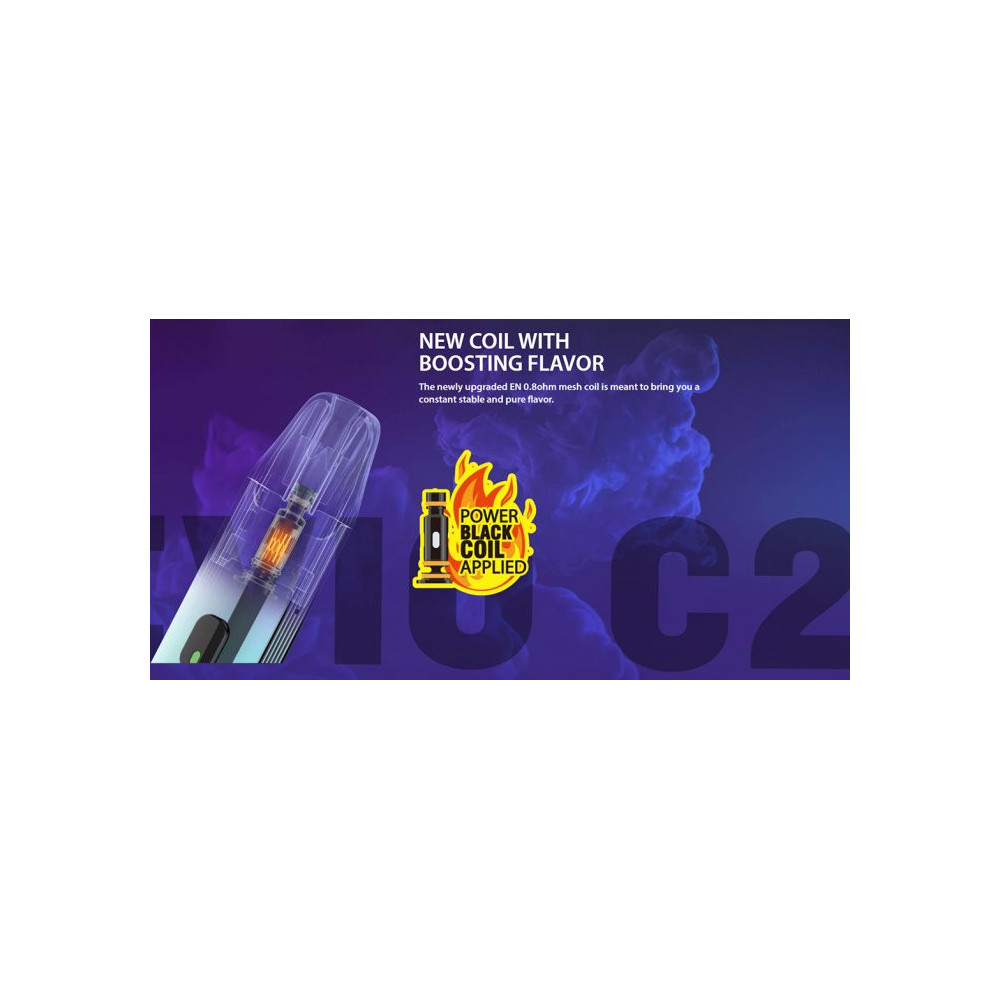 Vylepšená verze elektronické cigarety EVIO C. Oproti původnímu modelu upgradoval výrobce EN atomizer pro stabilní a čistou chuť liquidu. Díky jednoduchému otočení cartridge o 180 stupňů si můžete vychutnat MTL nebo RDL vaping. EVIO C2 baterie disponuje vestavěným monočlánkem o kapacitě 800mAh s LED indikátorem stavu nabití, USB-C portem pro rychlé nabíjení za pouhých 30min a s maximálním výkonem až 18W. Cartridge s atomizerem EN je plně kompatibilní s cartridgemi EVIO C. Žhavicí hlavu je nezbytné pravidelně měnit pro zachování chuti a funkčnosti zařízení. Její výdrž je individuální.