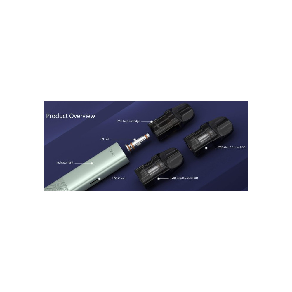 Nový přírůstek do rodiny Joyetech EVIO s kapacitou cartridge 2,8 ml, dobíjecí baterií 900 mAh s indikátorem stavu nabití a automatickým výkonem až 20 W. Tento všestranný podsystém je navržený tak, aby byl dokonalým společníkem pro každodenní vapování. Vyměnitelná cartridge (POD) s vestavěným atomizerem o odporu 0,8 ohm pojme až 2,8 ml liquidu. K dispozici je také cartridge o odporu 0,6 ohm nebo s vyměnitelným atomizerem řady EN. Žhavicí hlavu je nezbytné pravidelně měnit pro zachování chuti a funkčnosti zařízení. Její výdrž je individuální.