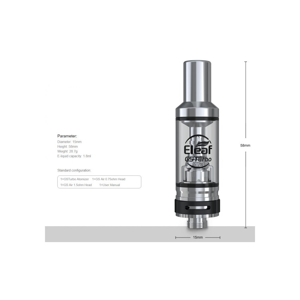 Oblíbená řada clearomizeru GS byla obohacena o nový přírůstek GSTurbo. Jeho velkou předností je široký a regulovatelný přívod vzduchu s 5-ti otvory pro optimální kouřivost. Objem nádržky činí 1.8ml a je kompatibilní s žhavicími hlavami GS Air. Vyroben z nerezové oceli a Pyrexu.