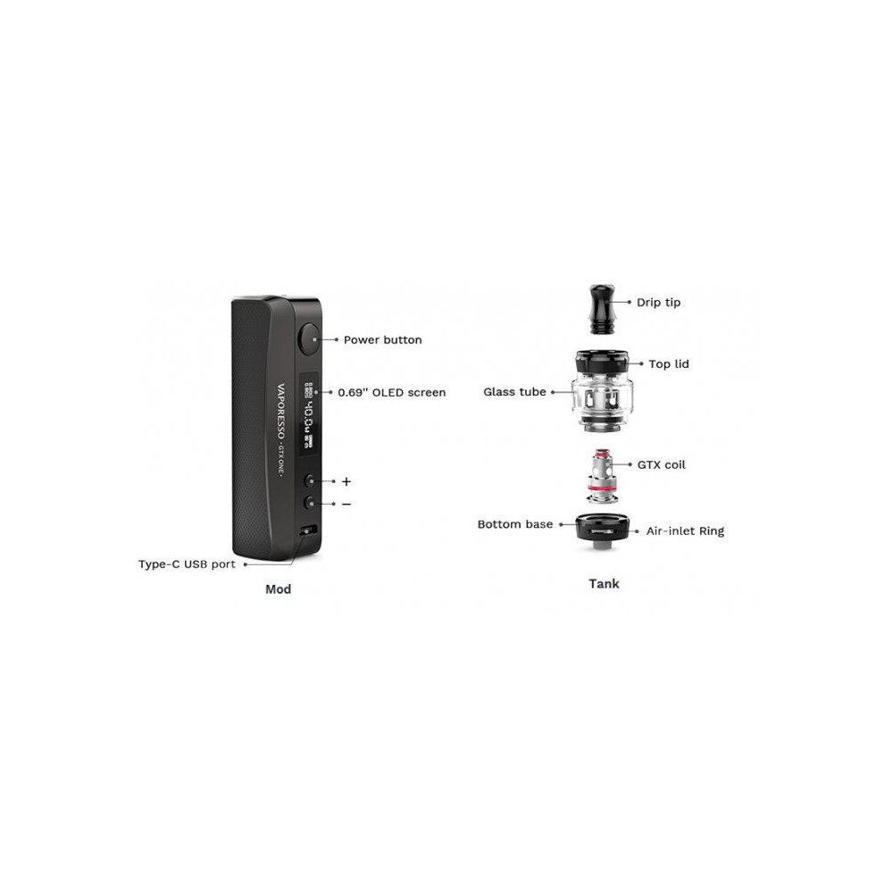 Grip Vaporesso GTX ONE se prezentuje vestavěnou baterií o kapacitě 2000 mAh s rychlým 2A USB-C nabíjením a nastavitelným výkonem až 40W. Propracovaná konstrukce gripu disponuje přehledným 0,69 palcovým displejem a pohodlným spínacím tlačítkem. Mezi další přednosti patří ochrana proti zkratu, přehřátí a nízkému odporu. Všechny fanoušky MTL a DTL vapování potěší přiložený clearomizer GTX Tank s vrchním plněním, objemem nádržky 3 ml a žhavicími hlavami GTX. Náhradní žhavicí hlavy najdete ZDE