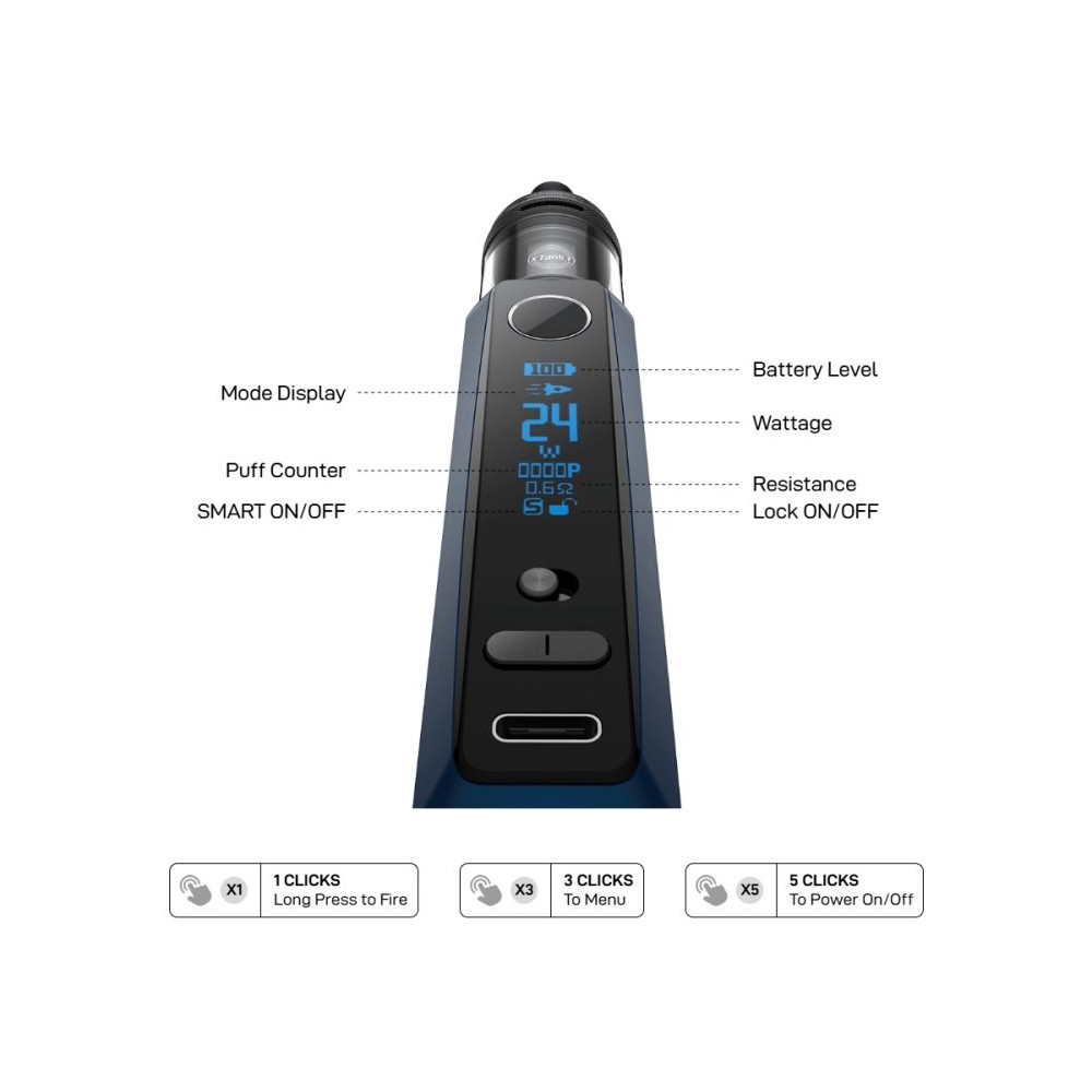 Kompaktní, elegantní a výkonný pod kit nové generace. Baterie 3000m Ah, OLED displejem, čip AXON s Pulse technologií, Xtank T 3 ml s horním plněním a ochranou proti protékání. Kompatibilní s celou řadou GTX hlav pro MTL i RDL.