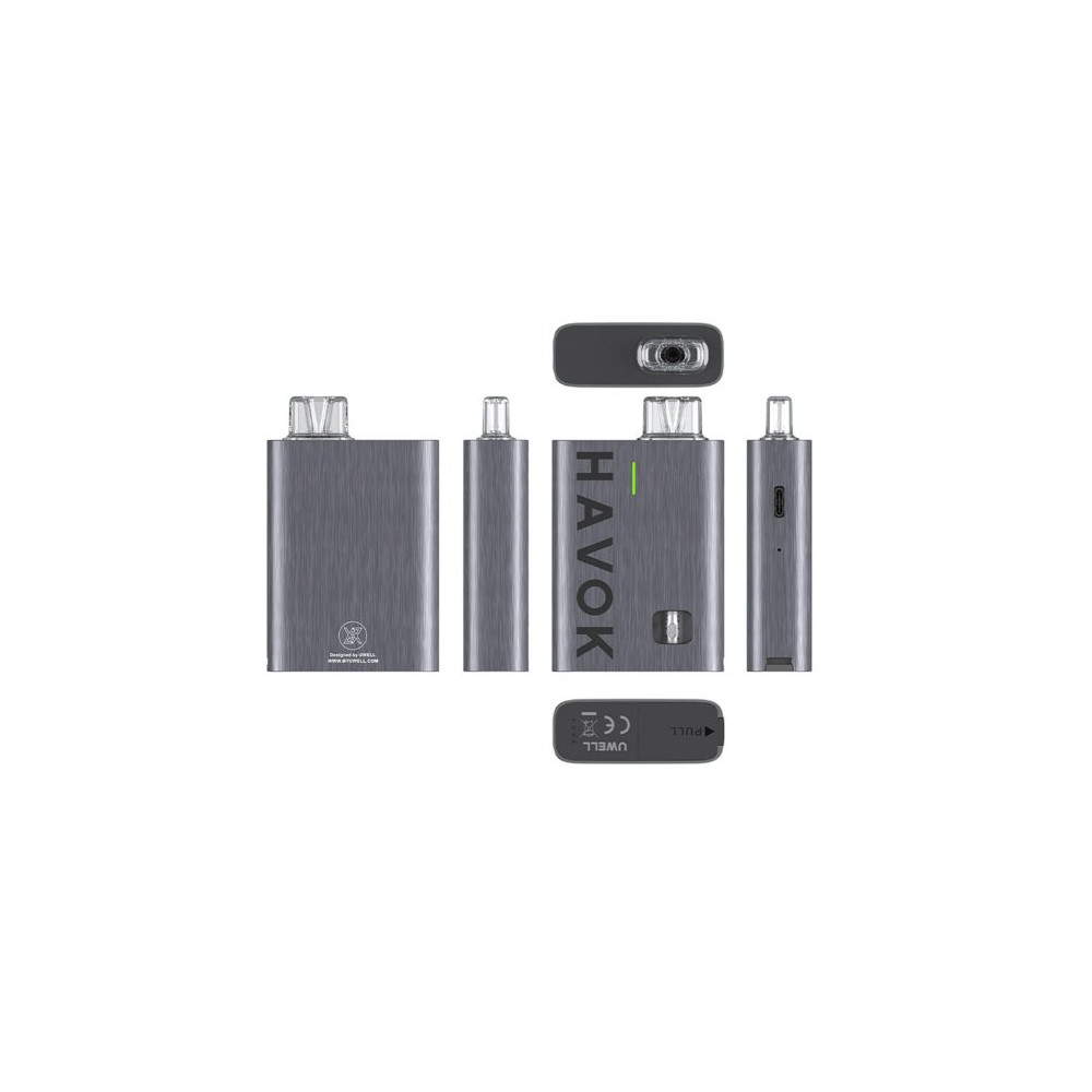 Elektronická cigareta Uwell Havok R se vyznačuje svým neotřelým designem a hlavně inovativní instalací cartridge, která se vkládá zespodu těla baterie = zamezení protečení liquidu. Vestavěný monočlánek o kapacitě 950 mAh s automatickým výkonem až 22 W, LED indikátor stavu nabití a USB-C port pro rychlé nabití. Cartridge Havok R o objemu 3 ml disponuje integrovanou žhavicí cívkou o odporu 0,6 ohm. Žhavicí hlavu je nezbytné pravidelně měnit pro zachování chuti a funkčnosti zařízení. Její výdrž je individuální.
