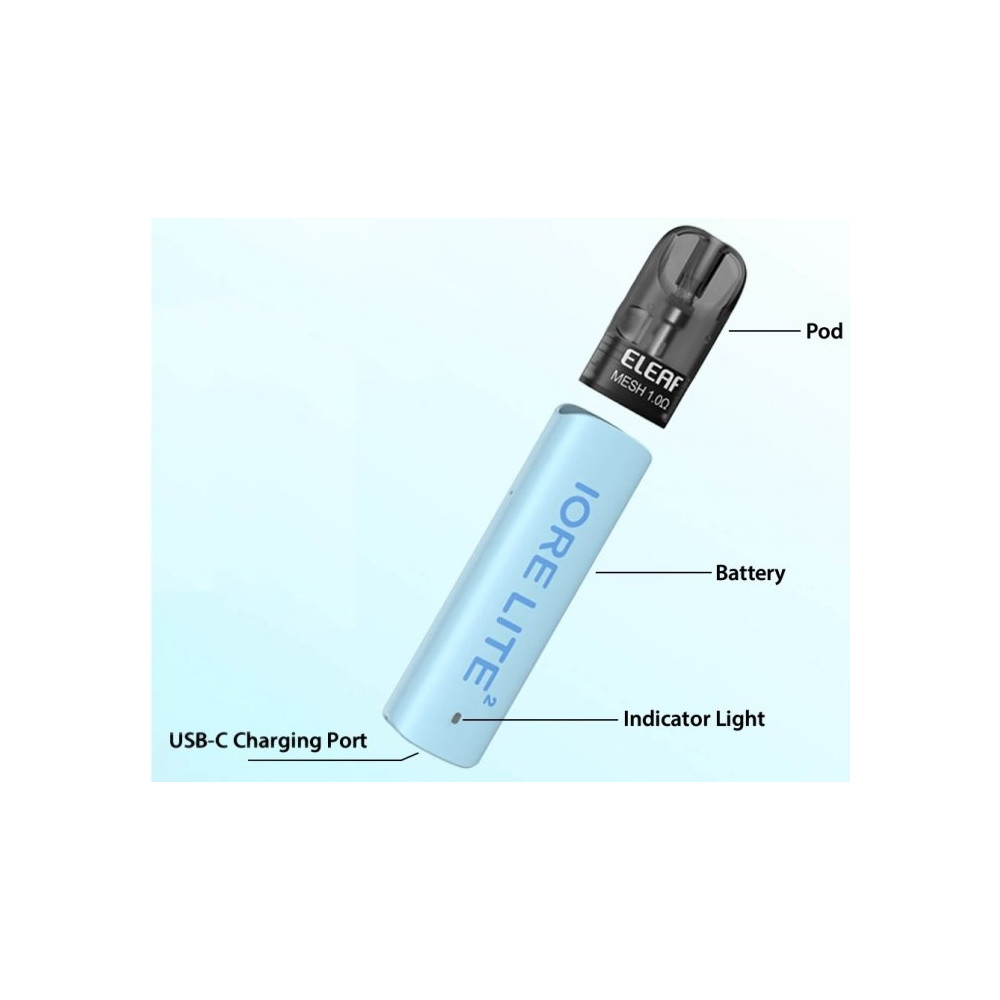 Druhá řada oblíbené nízkonákladové elektronické cigarety s populárním POD systémem od společnosti Eleaf. Integrovaný monočlánek o kapacitě 490mAh disponuje LED indikátorem stavu nabití, automatickým výkonem až 12W a USB-C portem pro rychlé nabíjení. Cartridge (POD) s pohodlným bočním plněním o objemu 2ml obsahuje integrovanou žhavící hlavu Mesh o odporu 1ohm. Při opotřebení žhavicí hlavy tedy vyměníte celou cartridge. Žhavicí hlavu je nezbytné pravidelně měnit pro zachování chuti a funkčnosti zařízení. Její výdrž je individuální.