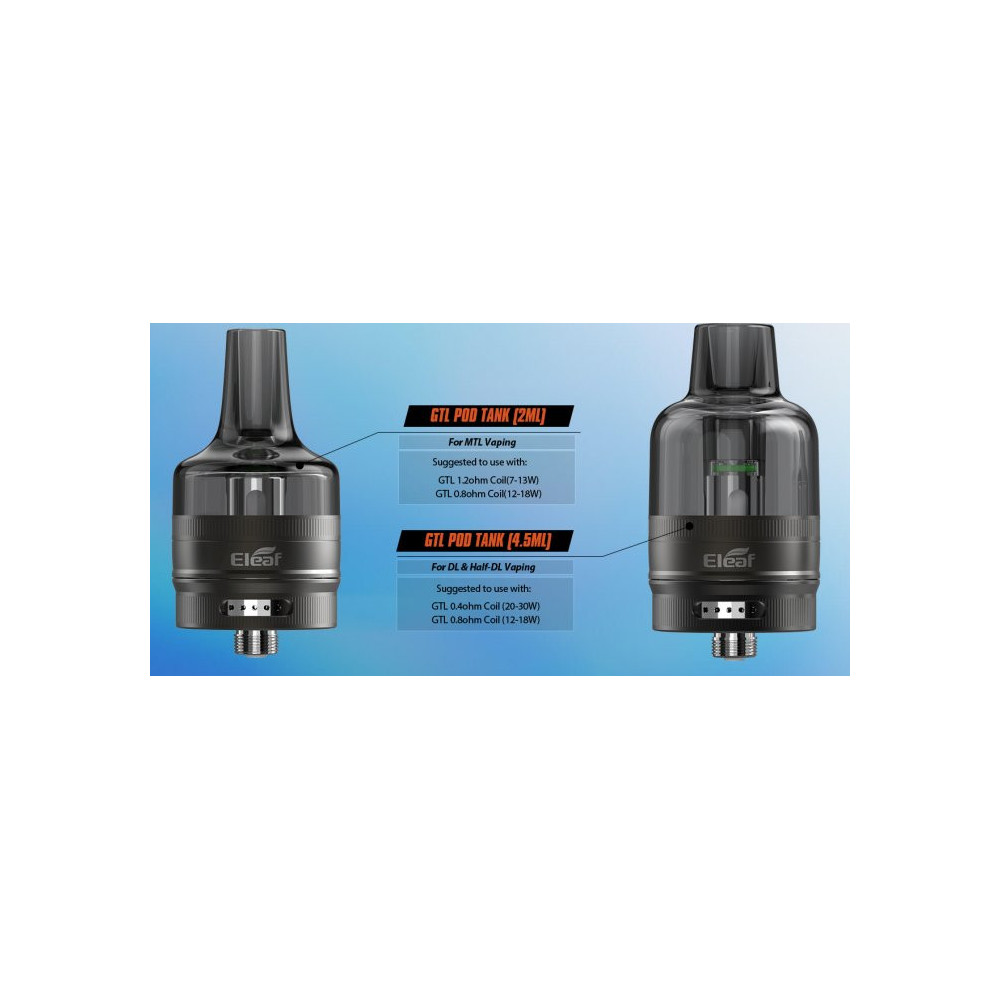 Další z členů nejpopulárnější a nejoblíbenější řady gripů od Eleaf. Celokovové tělo ukrývá vestavěnou baterii s kapacitou 3000 mAh, která je podporována inovativním systémem rychlého nabíjení QC3.0 s dobou nabíjení pouhých 90 minut. Nabízí nastavitelný výkon až 80W. Přehledný OLED displej ukazuje detailní informace o nastavení. Nechybí ochrana proti zkratu, přehřátí, přežhavení, nízkému odporu a 10-ti vteřinová ochrana žhavení. Clearomizer GTL Pod je vybaven klasickým 510 závitem a inovativním spodním plněním.