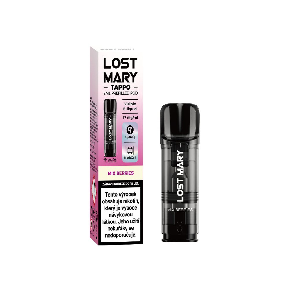 Cartridge LOST MARY TAPPO obsahují 2 ml liquidu s obsahem nikotinové soli o síle nikotinu 17 mg. Jsou naplněny prémiovým liquidem s nikotinovou solí, díky které dochází k rychlejší a kvalitnější vstřebatelnosti = bez dráždivého pocitu v krku oproti klasickým liquidům. Nedílnou součástí cartridge je spirálka Mesh QUAQ, která kombinuje ultra jemnou síťovinu s vysoce absorpční bavlnou. Poměr 50 VG / 50 PG.