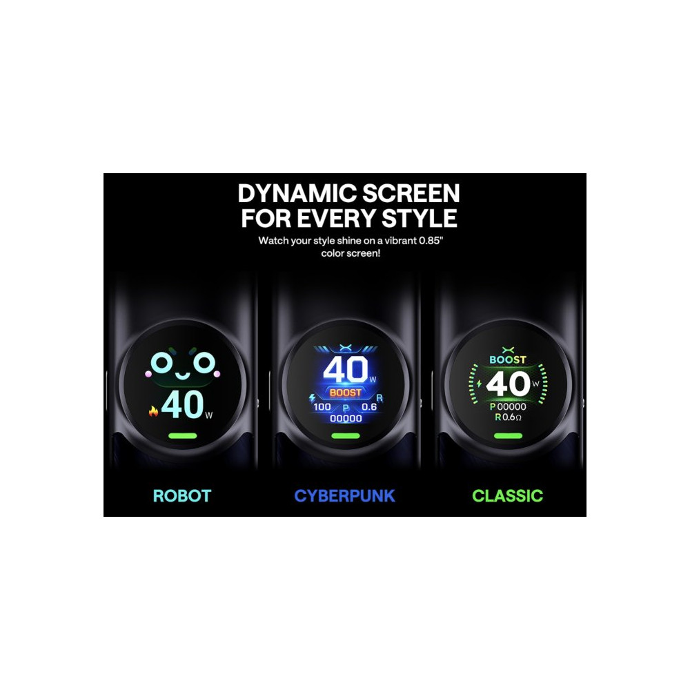 Součástí zařízení je velkokapacitní 4 ml cartridge, která umožňuje více než 15 naplnění a disponuje 5vrstvou ochranou proti úniku, což zaručuje spolehlivý a čistý provoz. Přehledný 0,85" barevný displej poskytuje snadný přístup ke všem nastavením zařízení a zobrazuje důležité informace. Integrovaná 1500 mAh baterie s rychlým nabíjením 5V / 2A zajišťuje dlouhou výdrž a rychlé doplnění energie. Kromě toho zařízení umožňuje nastavení výkonu v rozmezí 5 – 40 W, díky čemuž si každý uživatel může přizpůsobit zážitek z vapování podle svých preferencí.