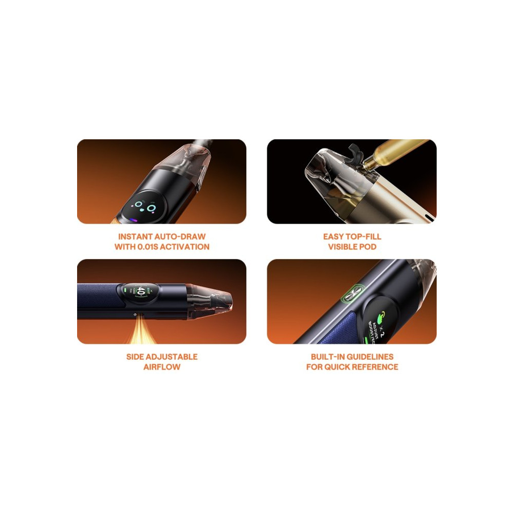 Součástí zařízení je velkokapacitní 4 ml cartridge, která umožňuje více než 15 naplnění a disponuje 5vrstvou ochranou proti úniku, což zaručuje spolehlivý a čistý provoz. Přehledný 0,85" barevný displej poskytuje snadný přístup ke všem nastavením zařízení a zobrazuje důležité informace. Integrovaná 1500 mAh baterie s rychlým nabíjením 5V / 2A zajišťuje dlouhou výdrž a rychlé doplnění energie. Kromě toho zařízení umožňuje nastavení výkonu v rozmezí 5 – 40 W, díky čemuž si každý uživatel může přizpůsobit zážitek z vapování podle svých preferencí.