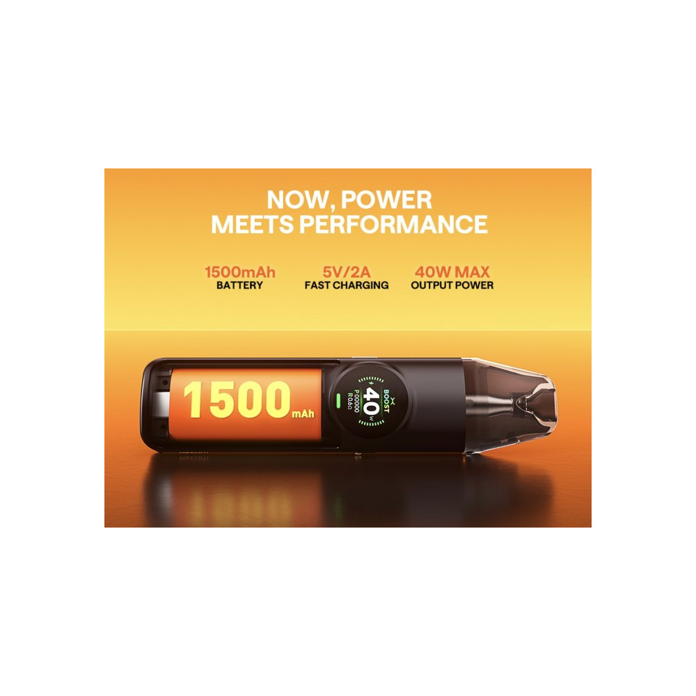 Součástí zařízení je velkokapacitní 4 ml cartridge, která umožňuje více než 15 naplnění a disponuje 5vrstvou ochranou proti úniku, což zaručuje spolehlivý a čistý provoz. Přehledný 0,85" barevný displej poskytuje snadný přístup ke všem nastavením zařízení a zobrazuje důležité informace. Integrovaná 1500 mAh baterie s rychlým nabíjením 5V / 2A zajišťuje dlouhou výdrž a rychlé doplnění energie. Kromě toho zařízení umožňuje nastavení výkonu v rozmezí 5 – 40 W, díky čemuž si každý uživatel může přizpůsobit zážitek z vapování podle svých preferencí.