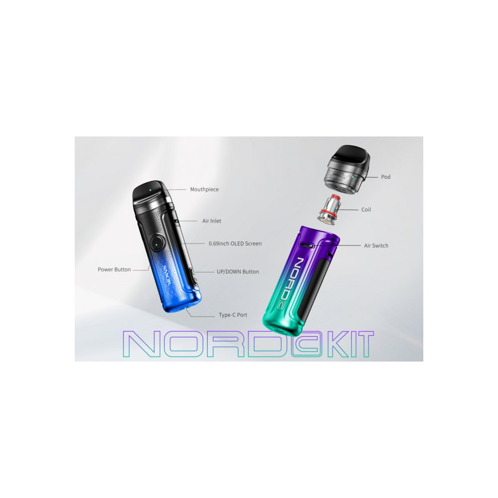 Zbrusu nový model elektronické cigarety NORD C, který vás na první pohled zaujme svým futuristickým zpracováním. S tímto parťákem si na cestě vapingu užijete nepřekonatelný DL zážitek za doprovodu té nejlepší chuti liquidu. Kompaktní tělo baterie přináší vestavěný monočlánek o kapacitě 1800 mAh, nastavitelný výkon až 50 W, inovativní regulaci přívodu vzduchu AFC a rychlé nabíjení pomocí USB-C portu. Na boční straně je umístěn OLED displej, který umožňuje jednoduché nastavení hodnot a zobrazuje všechny potřebné informace. Mezi další přednosti patří ochrana proti zkratu a přehřátí či osmi vteřinová ochrana žhavení. Cartridge Nord C o objemu 4,5 ml spolupracuje se žhavicími hlavami RPM 2. Žhavicí hlavu je nezbytné pravidelně měnit pro zachování chuti a funkčnosti zařízení. Její výdrž je individuální.