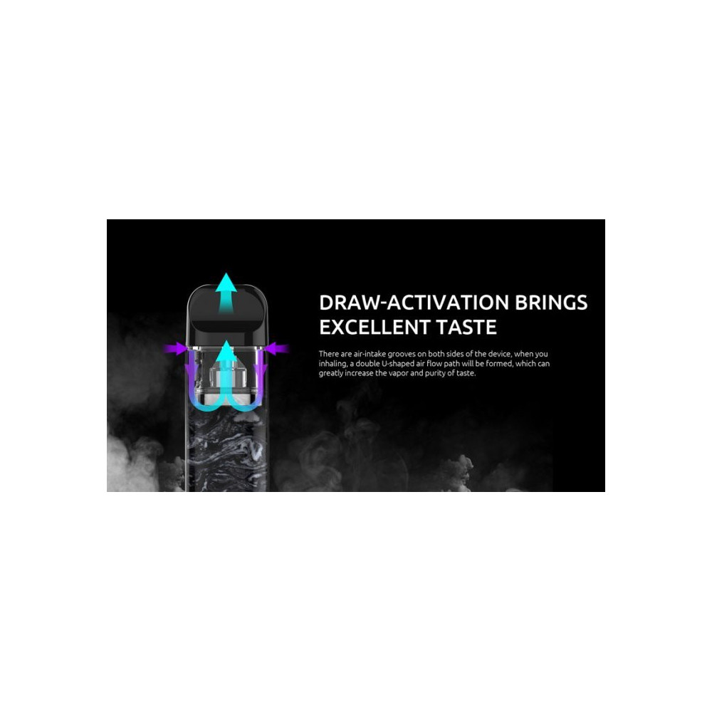 Maximální výkon je 25W. Inovativní cartridge (POD) s objemem 2,0 ml je přizpůsobena pro pohodlné vapování a nabízí nové modely vestavěných žhavících hlav - NOVO 2 Mesh s odporem 1,0 ohm a NOVO 2 DC MTL s odporem 1,4 ohm.