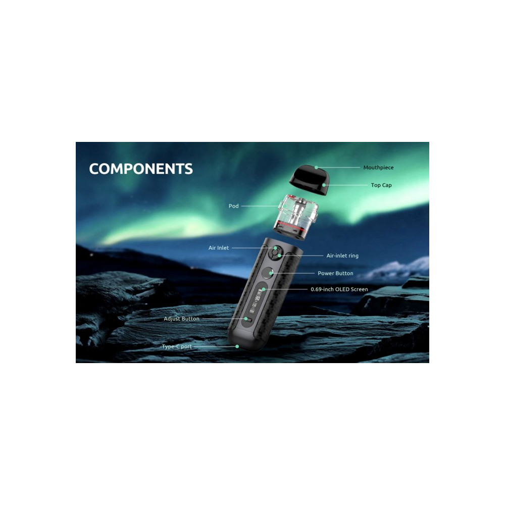 POD systém s výkonem až 30W, s baterií 900 mAh / cartridge s vyměnitelnou žhavicí hlavou 2 ml / MTL.