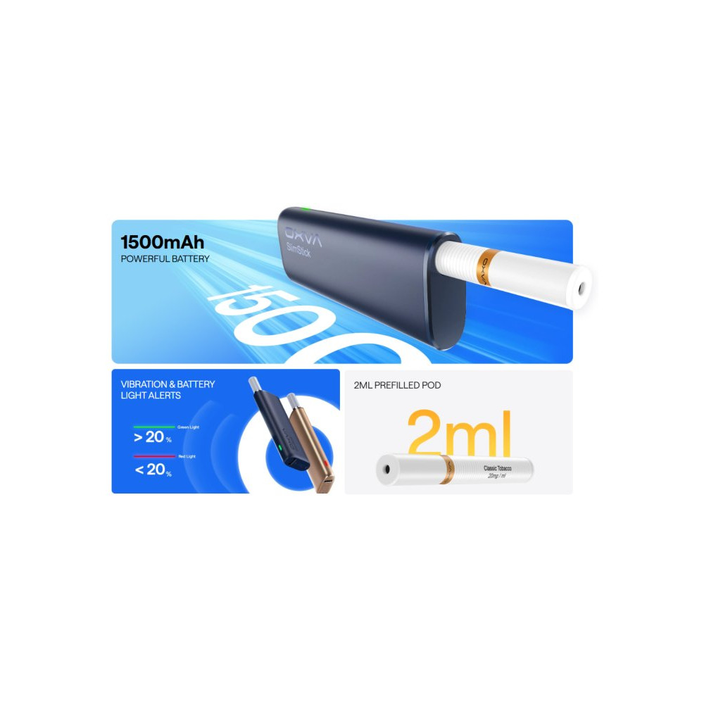 SLIMSTICK je kompaktní a výkonná elektronická cigareta s předplněnou cartridgí o objemu 2 ml. Odlehčené tělo baterie disponuje vestavěným monočlánkem o kapacitě 1500 mAh a LED indikátorem stavu nabití. Předplněné cartridge OXVA SLIMSTICK obsahují 2 ml prvotřídního e-liquidu a jsou přizpůsobeny pro MTL vapování, což je stejný princip jako při kouření klasických cigaret. E-liquid o síle 20 mg obsahuje nikotinovou sůl, díky které dochází k rychlejší a kvalitnější vstřebatelnosti, bez dráždivého pocitu v krku oproti klasickým liquidům. Nedílnou součástí cartridge je spirálka Mesh pro rychlejší žhavení, rovnoměrné odpařování, vynikající chuť liquidu a větší tvorbu páry.