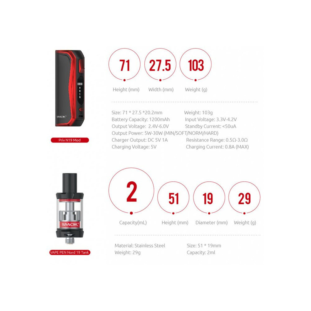 Mezi další přednosti patří ochrana proti zkratu a přehřátí nebo osmi vteřinová ochrana žhavení. Clearomizer Nord 19 je osazen žhavícími hlavami Nord, které se osvědčily ve stejnojmenné elektronické cigaretě. Odpor 0,6 ohm a 0,8 ohm je pak ideální jak pro produkci páry, tak i pro skvělé podání chuti.