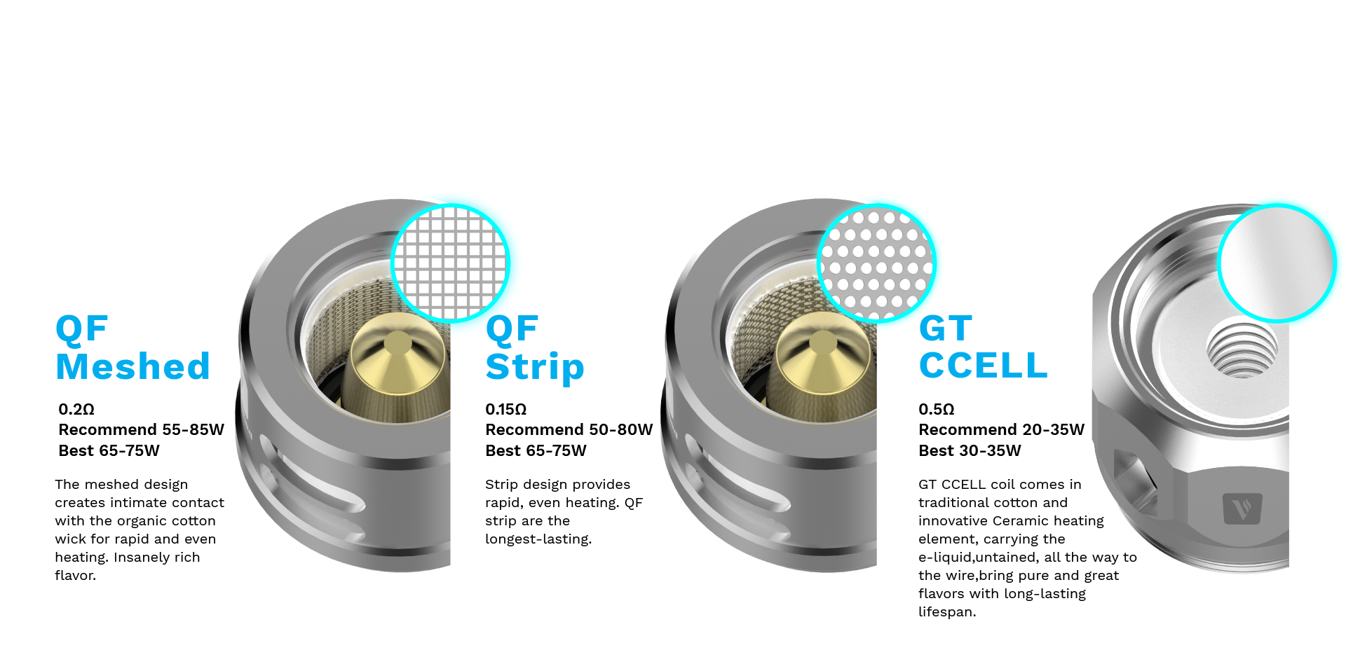 Náhradní žhavicí hlava využívá technologii Strips, kde je klasická spirálka nahrazena "síťovou mřížkou" ze žhavicích drátů s rychlým procesem rozžhavení a velkou tvorbou páry. Speciální QF vložka v těchto hlavách je zcela jedinečná. Technologie uvnitř žhavící hlavy eliminuje prskání a protékání liquidu a pomáhá udržovat teplo v hlavě, což přináší bohatší chuť a hladké obláčky kouře. K tomu dopomáhá i nové složení organické vaty uvnitř hlav – kombinace lněného vlákna s bavlnou. Kompatibilní s řadou žhavicích hlav GT.