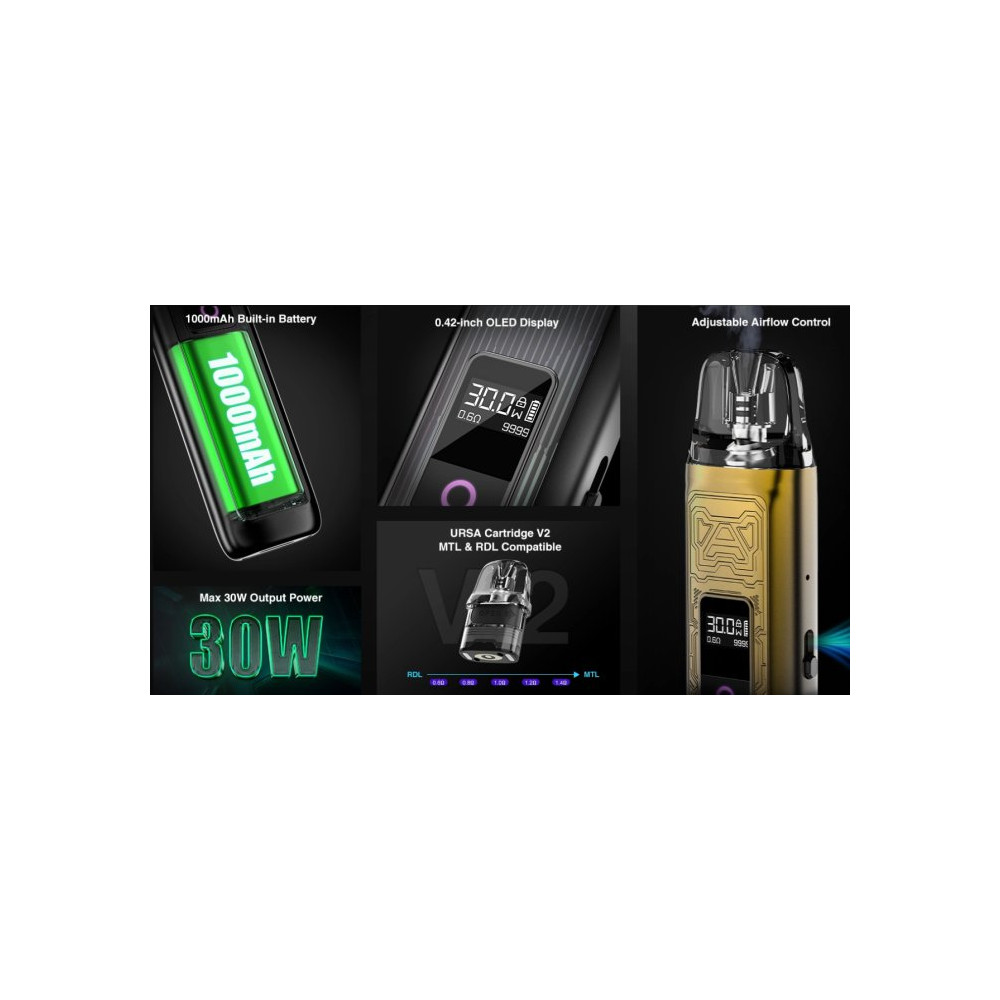 Druhá řada oblíbené elektronické cigarety s POD systémem Ursa Nano Pro 2 od Lost Vape. Kompaktní tělo baterie je vyrobeno z kvalitní zinkové slitiny, obsahuje vestavěný monočlánek o kapacitě 1000 mAh a disponuje výkonem až 30 W. Postranní airflow je regulován pomocí speciální páčky, která umožní si vzduch nastavit přesně podle individuální chuti. Baterie je vybavena upgradovými cartrigemi Ursa Nano V2 pro bohatší chuť liquidu s příjemnějším tvarem náustku. Cartridge jsou plně kompatibilní s předchozí řadou. Nabíjení obstarává USB-C port. Žhavicí hlavu je nezbytné pravidelně měnit pro zachování chuti a funkčnosti zařízení. Její výdrž je individuální.