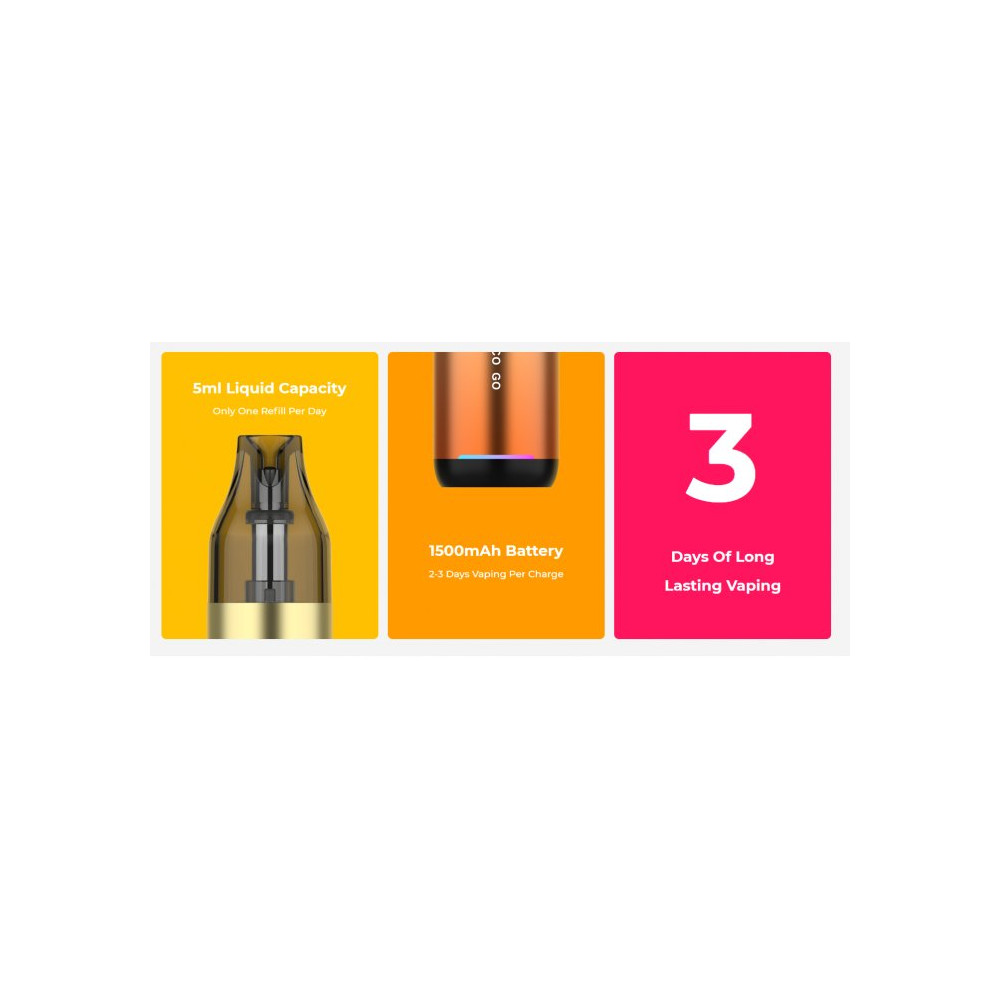 Perfektní vapovací zařízení ve stylu pera pro začátečníky, kteří hledají jednoduchost bez kompromisů v kvalitě vapingu. Elegantní a stylový design baterie disponuje vestavěným monočlánkem o kapacitě 1500 mAh s rychlonabíjením typu USB-C 5V/2A a automatickým výkonem až 25 W. Vyměnitelná cartridge (POD) je vybavena žhavicí hlavou o odporu 0,6 ohm a 0,8 ohm s objemem nádržky 5 ml. Díky magnetickému propojení s baterií lze cartridge jednoduše vyjmout a doplnit oblíbeným liquidem. VECO GO využívá technologii zahřívání spirálky COREX, která zajišťuje přesné podání chuti a delší životnost. Magnetická podložka umožňuje regulaci proudění vzduchu pro optimální nastavení. Žhavicí hlavu je nezbytné pravidelně měnit pro zachování chuti a funkčnosti zařízení. Její výdrž je individuální.
