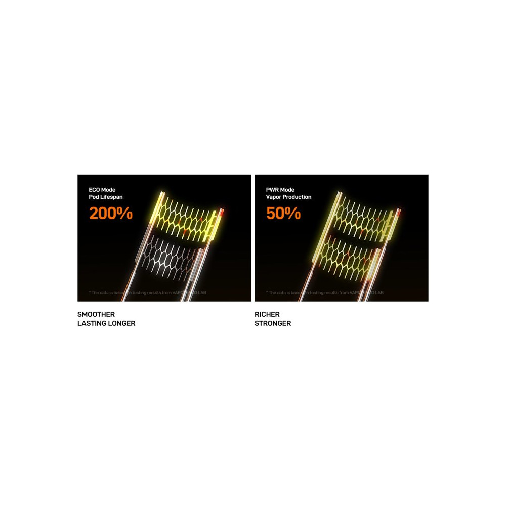 Vaporesso Vibe Pod Kit. Novinka zaujme nejen moderním vzhledem, ale především inovativní technologií Dual Mesh Coil, která přináší plnější chuť liquidu a delší životnost cartridge. Tělo baterie je vyrobeno z lehkého a odolného materiálu, který v sobě ukrývá monočlánek o kapacitě 1100 mAh s rychlým USB-C nabíjením (5V / 2A) a výkonným čipem AXON. Ten umožňuje přepínání mezi režimy ECO (úsporný výkon) a PWR (plný výkon), přičemž zařízení zároveň umožňuje regulaci airflow a přizpůsobení potahu od utaženého po volný. Na přední straně baterie se nachází praktické spínací tlačítko a barevný 0,54 palcový TFT displej, který informuje o stavu baterie i aktuálním režimu. Vyměnitelná cartridge o objemu 4,5 ml je navržena pro maximální výdrž. Žhavicí hlavu je nezbytné pravidelně měnit pro zachování chuti a funkčnosti zařízení. Její výdrž je individuální.