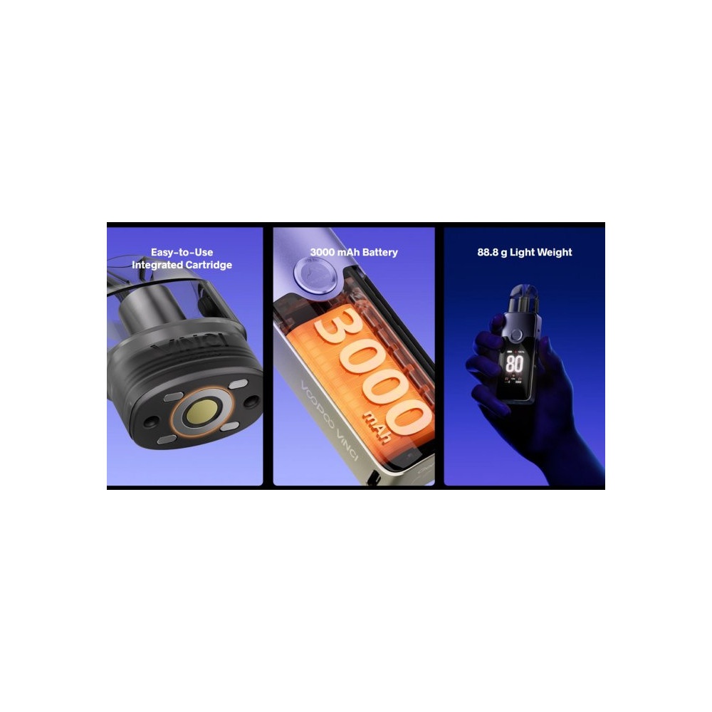 Sada VOOPOO VINCI E80 kombinuje vysoký výkon s uživatelsky přívětivým designem, díky čemuž je ideální jak pro úplné začátečníky, tak i zkušené vapery. Díky masivní vestavěné baterii o kapacitě 3000 mAh poskytuje zařízení až 80 W nastavitelného výkonu pro optimální zážitek z DTL i MTL vapování. Nová cartridge VINCI E má objem 5 m. E80 je vyrobena z odolné hliníkové slitiny a vybavena TFT 1,47 palcovým displejem, takže vyvažuje funkčnost s přenosností. Žhavicí hlavu je nezbytné pravidelně měnit pro zachování chuti a funkčnosti zařízení. Její výdrž je individuální.