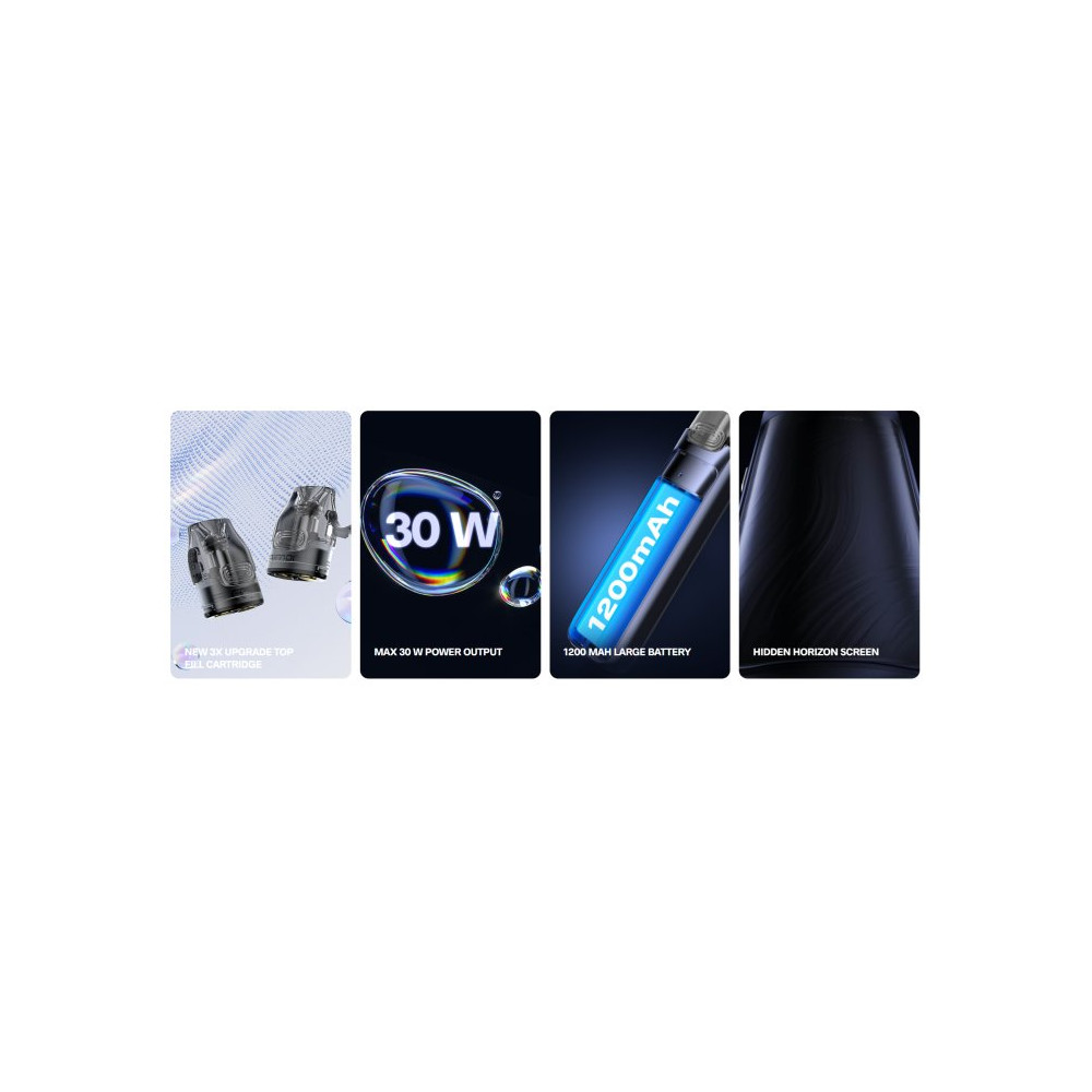 E-cigareta s integrovanou baterií 1200 mAh - až 30 W / kapacita cartridge s integrovanou žhavicí hlavou 3 ml.