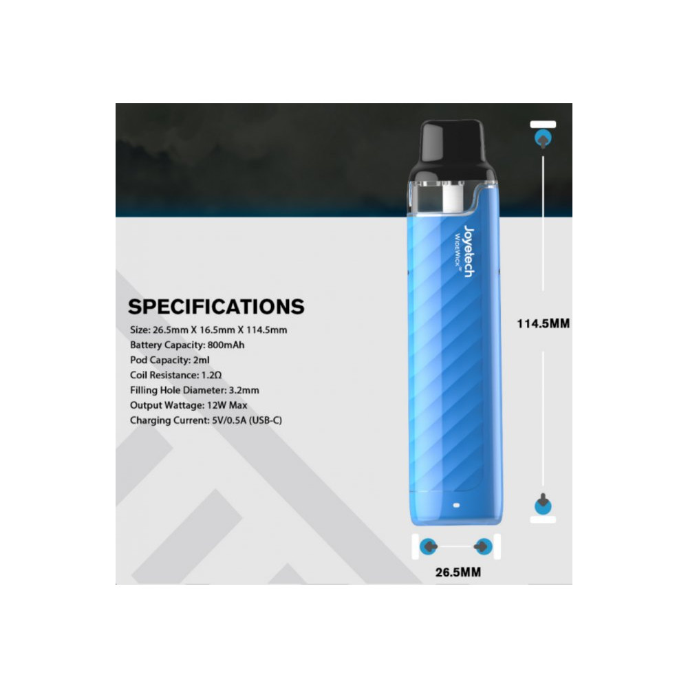 Druhá řada oblíbené nízkonákladové elektronické cigarety s nejpokročilejší technologií WideWickTM od společnosti Joyetech. Díky této technologii je žhavicí cívka omotána prvotřídní bavlnou ze všech stran, což v praxi zaručí nulové prskání nebo protečení. Každé potáhnutí je tak plné té nejlepší chuti a dry hity jsou minulostí. Integrovaný monočlánek o kapacitě 800 mAh disponuje LED indikátorem stavu nabití, automatickým výkonem až 12W a USB-C portem pro rychlé nabíjení. Cartridge (POD) s pohodlným vrchním plněním o objemu 2 ml obsahuje integrovanou žhavicí hlavu o odporu 1,2 ohm. Žhavicí hlavu je nezbytné pravidelně měnit pro zachování chuti a funkčnosti zařízení. Její výdrž je individuální.