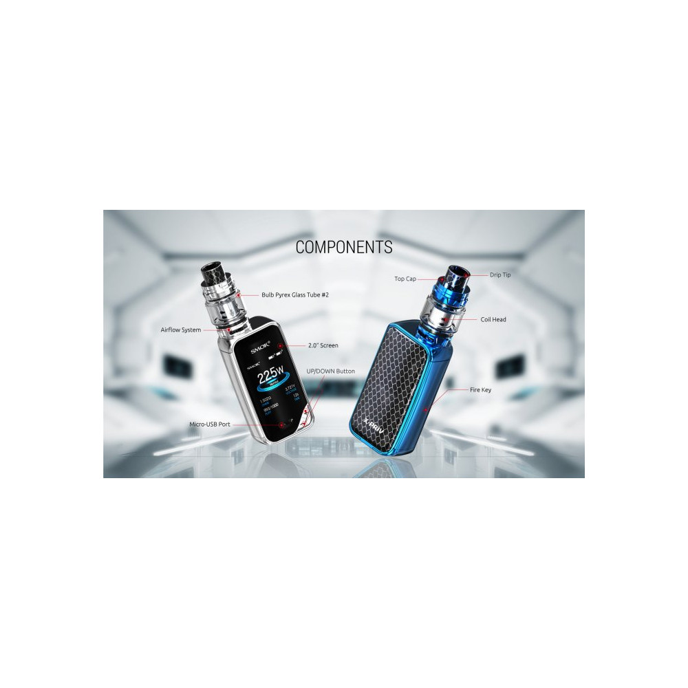 Grip s jednoduchými tvary, našlapaným agregátem o síle až 225W, poháněný dvěma bateriemi 18650. Milovníci teploty si také přijdou na své. Dvoupalcový displej zabírá celou jednu stranu gripu, díky čemuž je velice přehledný a dozvíte se tak velice rychle všechny důležité informace o nastavení a indikaci baterií. Ty lze nabíjet skrz USB konektor, přičemž Smok dodává vysoce kvalitní USB kabel, který jen přidává na dojmu luxusu. Smok tento grip osadil clearomizerem Prince s konvexní Pyrex nádržkou s objemem 8,0 ml. Tímto spojením si tedy můžete užívat opravdu dlouhého vapování bez rušivých elementů dobíjení a doplňování liquidu. Výběr žhavících hlav je opravdu široký.
