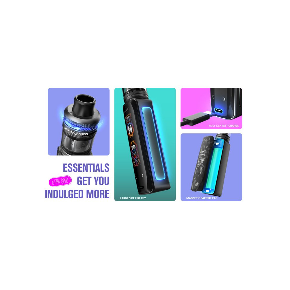 V dnešní době POD systémů nezapomíná Smoktech na milovníky pořádných mraků, a proto představuje grip X-PRIV SOLO, který dokonale spojuje styl a přenosnost v sub-ohmové kategorii. Přední panel je osazen přehledným a barevným displejem, díky kterému je nastavení zařízení jednoduchou a zábavnou záležitostí, nastavení výkonu a ovládání v menu je pomocí dotykových tlačítek na předním panelu. Po otočení o 180 stupňů se nachází pod designovým panelem s magnetickým úchytem prostor pro monočlánek typu 18650. Nastavitelný výkon 5 W až 80 W, pohodlné boční spínací tlačítko nebo ochrany proti zkratu, přehřátí, přežhavení a nízkému odporu jsou už jen krásnými vlastnostmi tohoto zařízení. Výrobce této sadě přidělil clearomizer TF-D SubTank s vrchním plněním a žhavícími hlavami D-COIL. Žhavicí hlavu je nezbytné pravidelně měnit pro zachování chuti a funkčnosti zařízení. Její výdrž je individuální.
