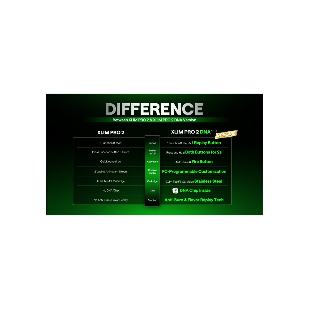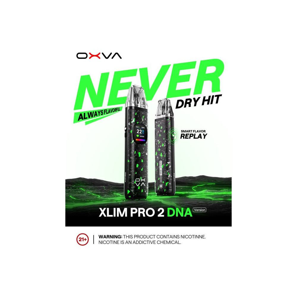 Prémiový pod systém OXVA XLIM PRO 2 DNA je postavený na pokročilém čipu EVOLV DNA, který je v komunitě pokročilých vaperů považován za technologický standard v oblasti přesnosti, bezpečnosti a uživatelské kontroly. Tento čip je vybaven technologií Replay, která umožňuje „zapamatovat si“ ideální potah a následně ho přesně opakovat – čímž zajišťuje konzistentní chuť při každém použití. Zároveň obsahuje systém ochrany proti dry hitu – čip analyzuje stav spirálky až 30 000 krát za sekundu a včas upraví výkon tak, aby nedošlo k připálení vaty ani při nízké hladině e-liquidu. Výsledkem je nejen lepší chuťový zážitek, ale i delší životnost cartridge. Tělo zařízení z luxusního kovaného karbonu a zinkové slitiny nejen skvěle vypadá, ale také vydrží každodenní používání. Baterie s kapacitou 1300 mAh podporuje výstupní výkon až 30 W a ve spojení s rychlým nabíjením přes USB‑C (5V / 2A) je ideální pro celodenní provoz bez zbytečných prostojů. Vapování je maximálně přizpůsobitelné – zařízení nabízí automatické i tlačítkové spouštění, boční regulaci airflow a k tomu 0,56″ barevný displej, na kterém uživatel najde všechny údaje přehledně zobrazené. Pokročilejší uživatelé navíc ocení možnost plného přizpůsobení výkonových křivek a parametrů přes Evolv Escribe software na PC. Žhavicí hlavu je nezbytné pravidelně měnit pro zachování chuti a funkčnosti zařízení. Její výdrž je individuální.