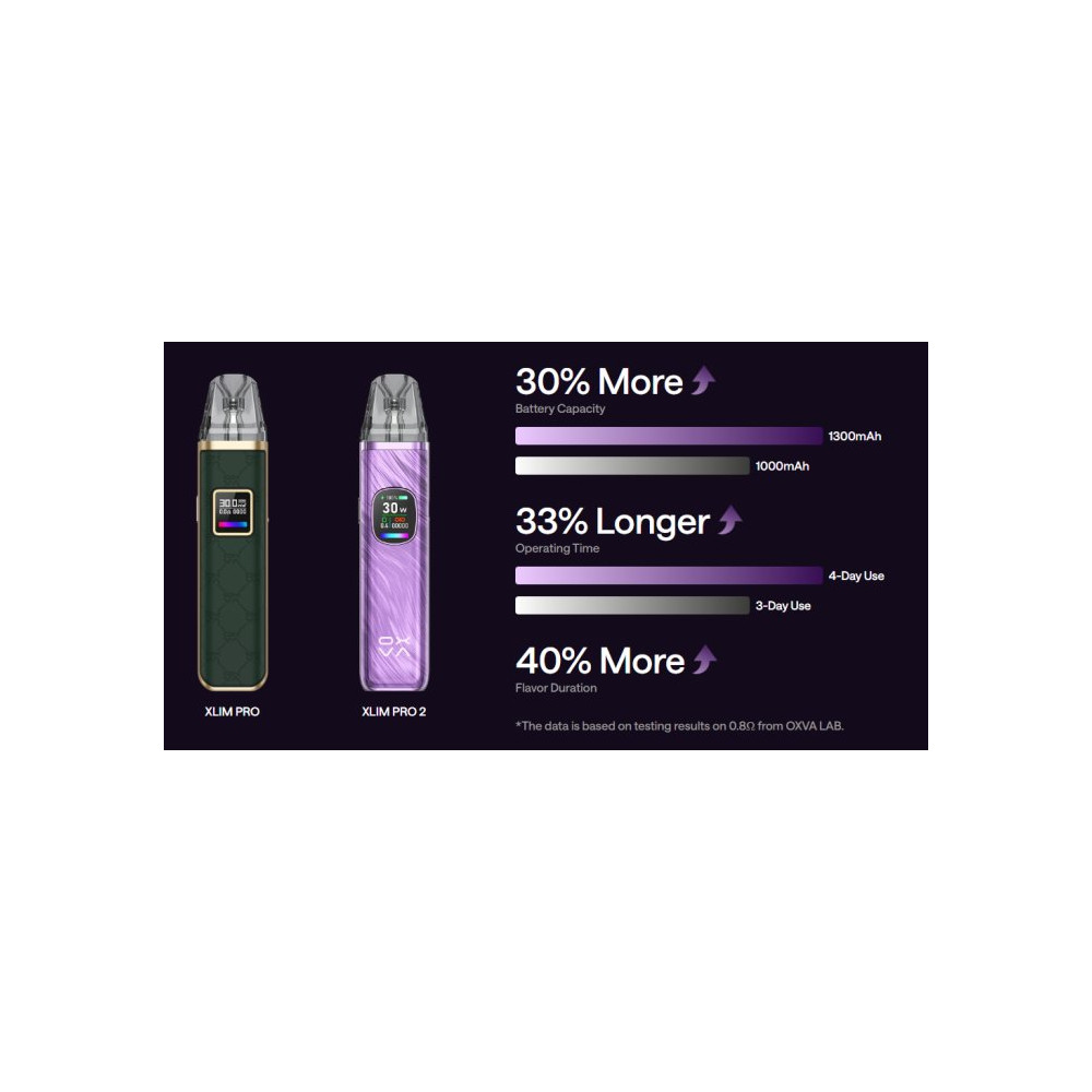 Elektronická cigareta OXVA Xlim Pro byla vyhlášena nejoblíbenějším POD zařízením mezi vapery za období 2023 a 2024. Výrobce přichází s druhou řadou, která si pro Vás přichystala mnoho novinek. Elegantní a čistý design těla baterie zdobí 0,56 palcový barevný Ultra-HD displej, který poskytuje vynikající přehled o nastavení všech hodnot. Vestavěný monočlánek nabízí vyšší kapacitu baterie 1300 mAh, USB-C port s 2A nabíjením a výkonem až 30 W. Na boční straně baterie je umístěno regulační tlačítko pro přívod vzduchu, díky kterému si jednoduše nastavíte RDL nebo MTL režim vapování. V obsahu balení najdete cartridge Xlim s horním plněním - není potřeba vytahovat cartridge z těla baterie při plnění liquidem. Žhavicí hlavu je nezbytné pravidelně měnit pro zachování chuti a funkčnosti zařízení. Její výdrž je individuální.