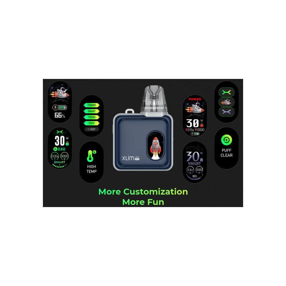 Moderně zpracované tělo baterie je pokryto technologií IML (In Mold Labeling) = vícevrstvá fólie zalitá plastem, opticky téměř nerozeznatelná od výrobků z pravého kovu, ovšem s výhodami plastu. Integrovaný monočlánek o kapacitě 1200 mAh disponuje rychlým USB-C nabíjením. Přední panel je obohacen o 0,96 palcový barevný TFT displej (Thin Film Transistor) pro snadné nastavení a zobrazení hodnot včetně zábavné tapety displeje. OXVA Xlim SQ Pro nabízí režimy Power a Smart o maximálním výkonu až 30 W. Tvorbu páry zajišťuje systém automatického žhavení - stačí pouze potáhnout z náustku. Na boční straně baterie je umístěno regulační tlačítko pro přívod vzduchu, díky kterému si jednoduše nastavíte RDL nebo MTL režim vapování. V obsahu balení nalezneme cartridge Xlim V3 s bočním plněním. Lze však použít i cartridge Xlim V2. Žhavicí hlavu je nezbytné pravidelně měnit pro zachování chuti a funkčnosti zařízení. Její výdrž je individuální.